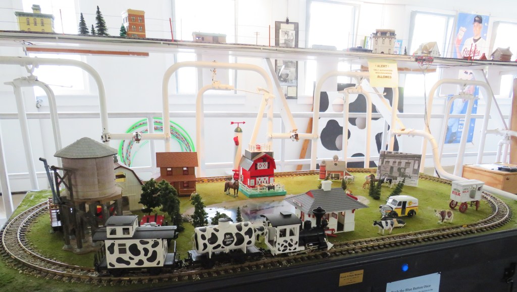 The King Barn Daily ‘MOOseum’ was erected on the site of a dairy farm. It tells the life of dairy farming in the region which, if you have recently visited Montgomery County, Maryland, mostly developed into housing communities with very little agricultural land. As you enter the barn, you will see it set up like a dairy barn with the cows in stalls being milked. (In case you are wondering, they are not real cows.) You see depicted the like of the farmers as well as the life of the dairy industry. Then you see a model train display.
