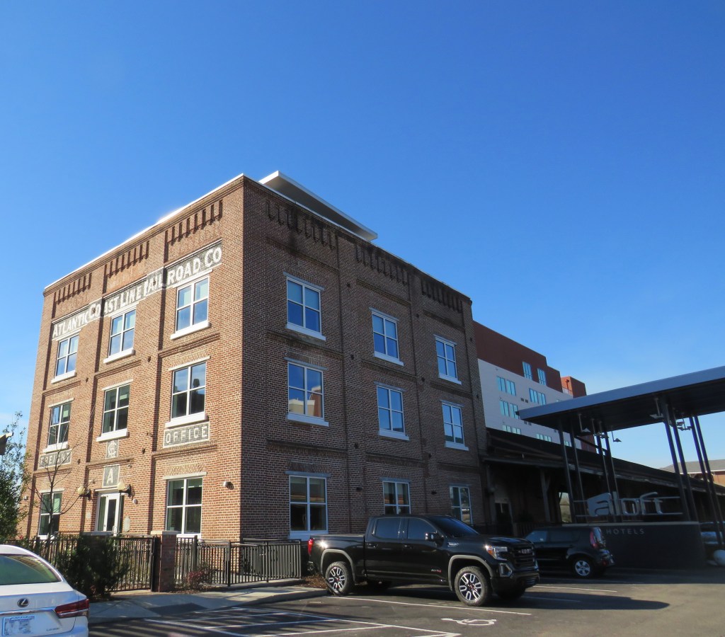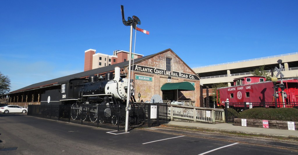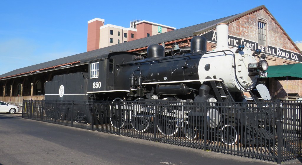 As you enter the Wilmington Railroad Museum, you see the hotel on the left, and you see the Atlantic Coast Line Railroad Locomotive Number 250 on the right next to another freight house originally owned by the Atlantic Coast Line Railroad. It is here where the museum is housed.