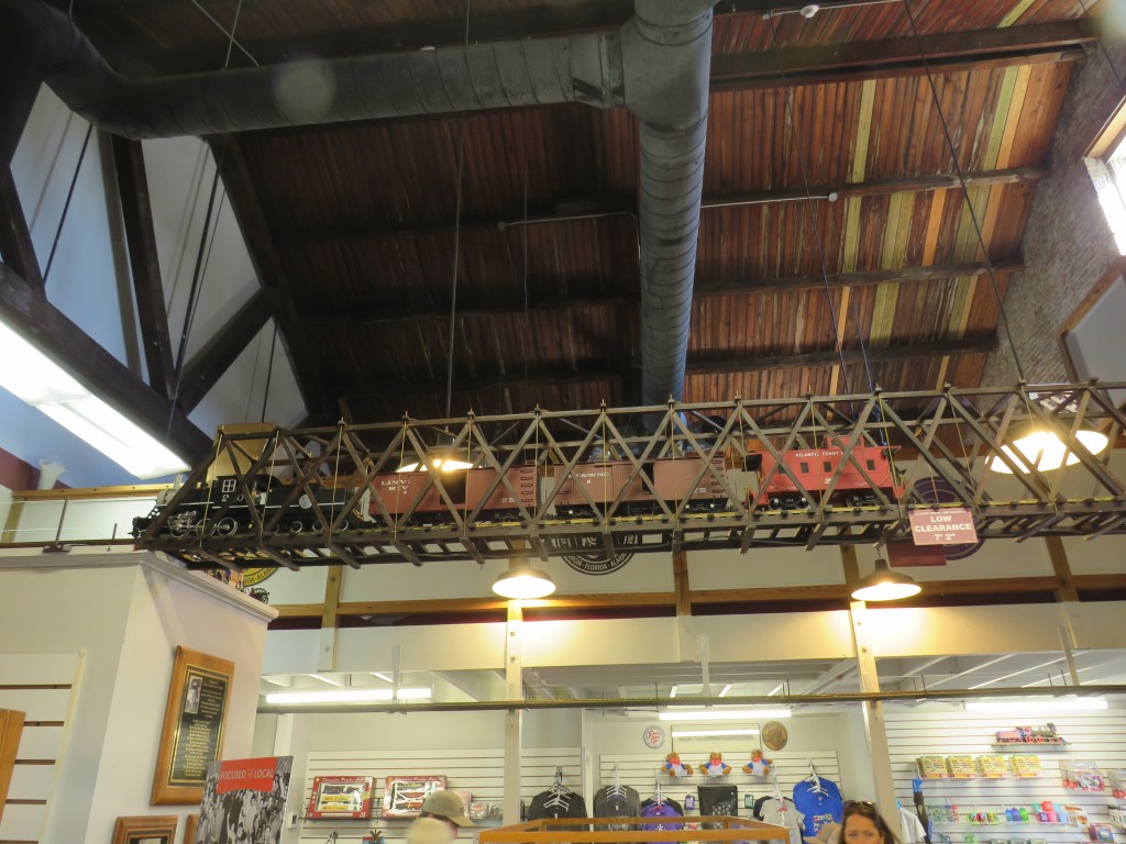 You enter the museum. The gift shop has a small model train display. It is the first of many model train displays you will see. You also see a model train above you. You begin to see that this is not your average railroad museum.