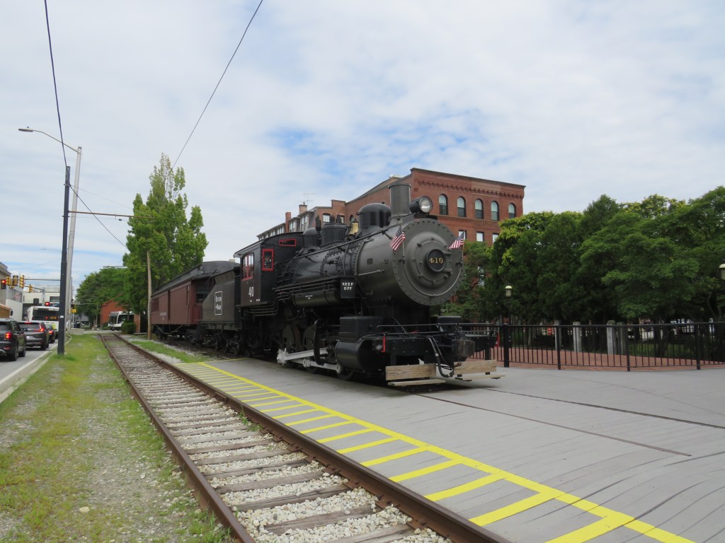 There is also another thing. What is the other thing? As you wait for the trolley at the Visitor Center, you can see an old train from the Boston and Maine Railroad. The train consist of Locomotive Number 410 and a combine car. The train pays tribute to the role that the Boston and Maine Railroad played in Lowell’s economy.