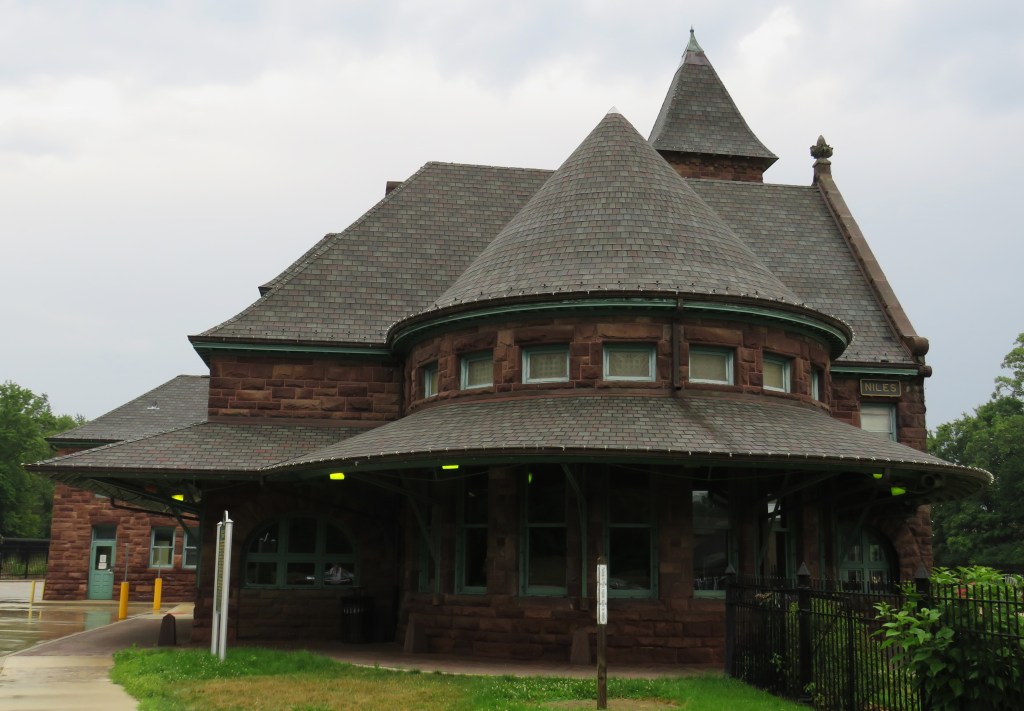 Then you have the town of Niles in the southwestern region of the U.S. state of Michigan. The train station in Niles was built by the Michigan Central Railroad in 1892. For a small town, it is one fancy Richardsonian Romanesque style station built with brownstone and gabled roofs with a sixty foot clock tower and a garden surrounding the station. The station was featured in the movies Continental Divide, Midnight Run, and Only the Lonely. If the builders were to see this station today, they would see the same train station that was built in 1892 as the exterior has not been altered. The interior has been rearranged with the elimination of the smoking rooms.